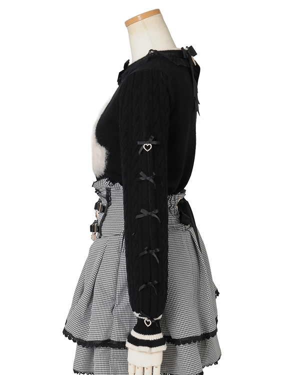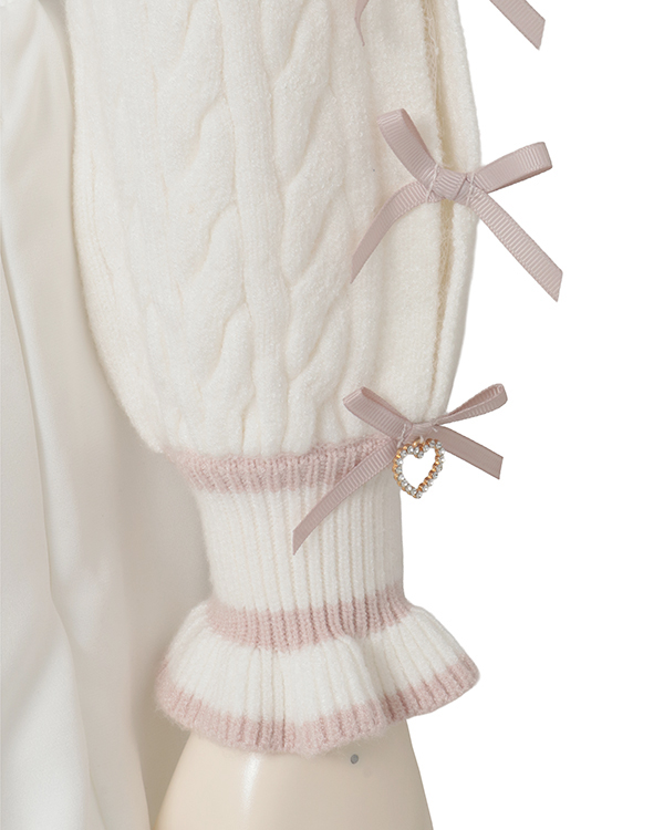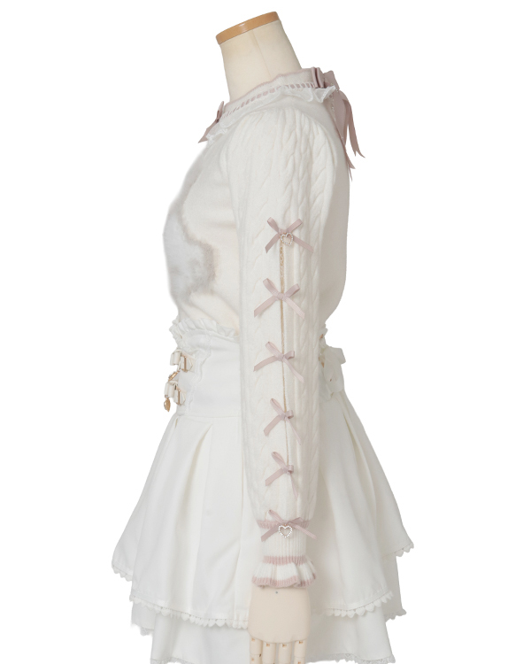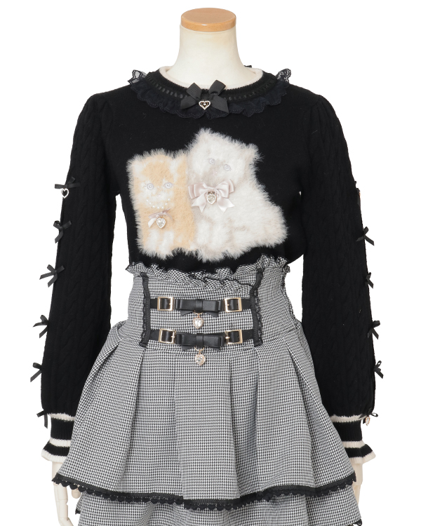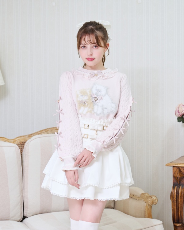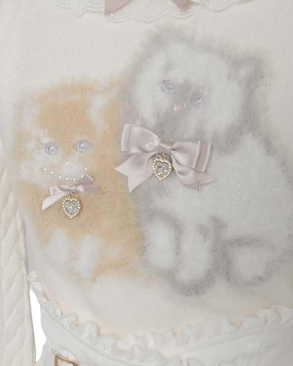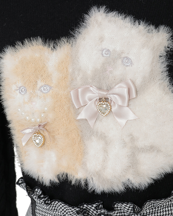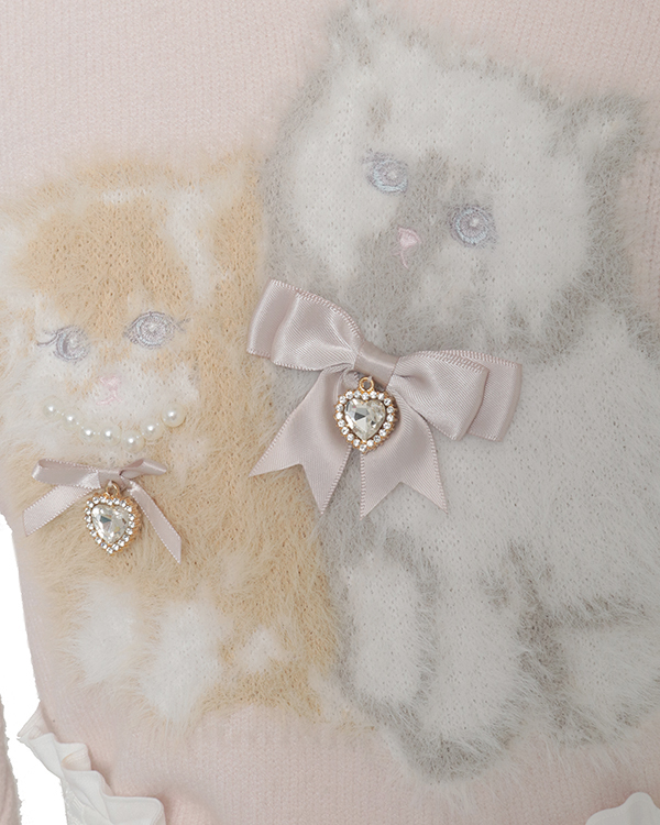 This knit features an adorable jacquard cat pattern on the front. The highlight is two stylish kitties accessorized with ribbons and pearl necklaces♡ The sleeves feature a slit and ribbon design, with attention to detail throughout for maximum cuteness. Its compact fit pairs perfectly with voluminous bottoms.