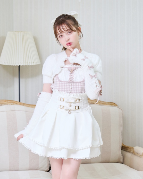 This frilly bolero cardigan features a charming ribbon design. The ribbon detail at the front hem is an adorable highlight. Its cropped length creates a flattering, leg-lengthening effect. Made from stretchy, soft-to-the-touch knit fabric, it offers comfortable wear. It's also recommended as a light layer for those times when a knit cardigan feels too warm.