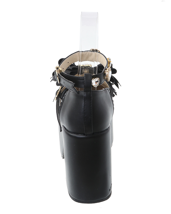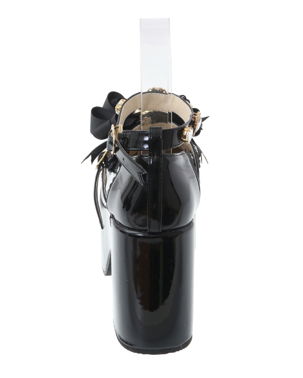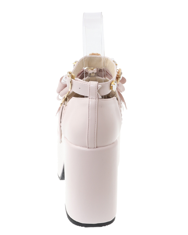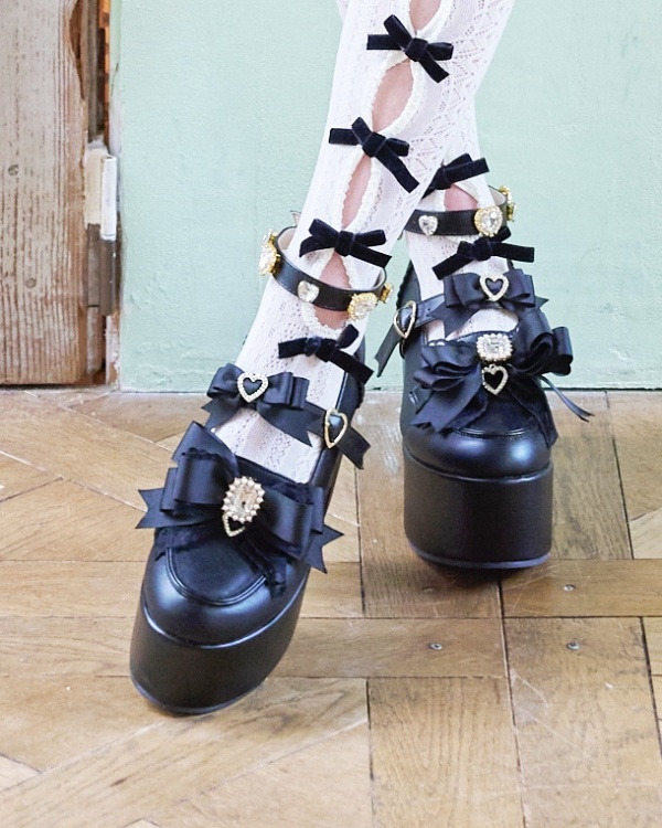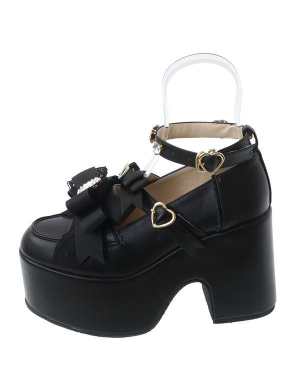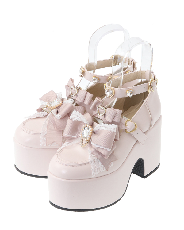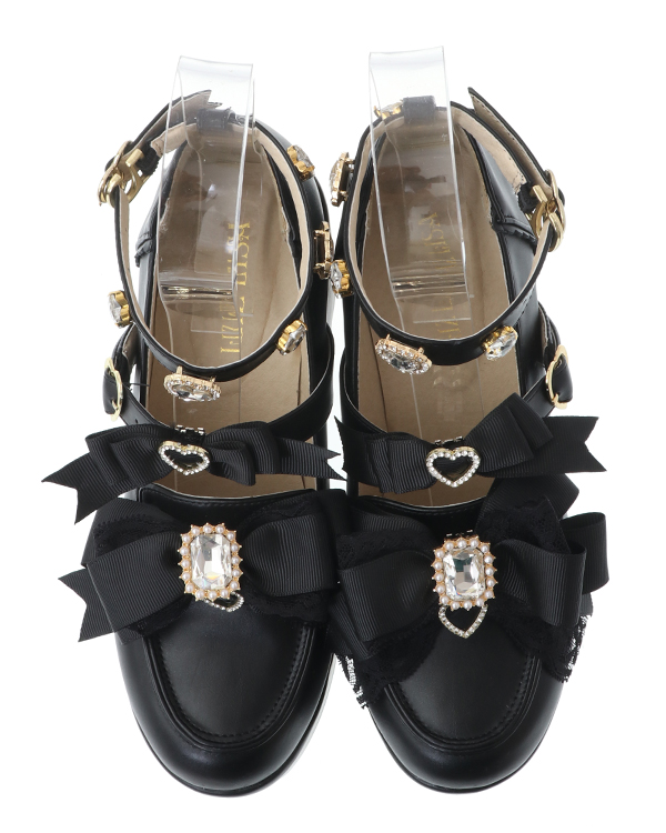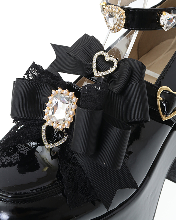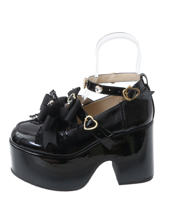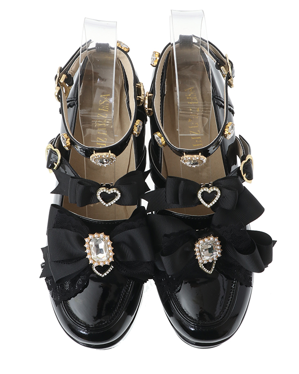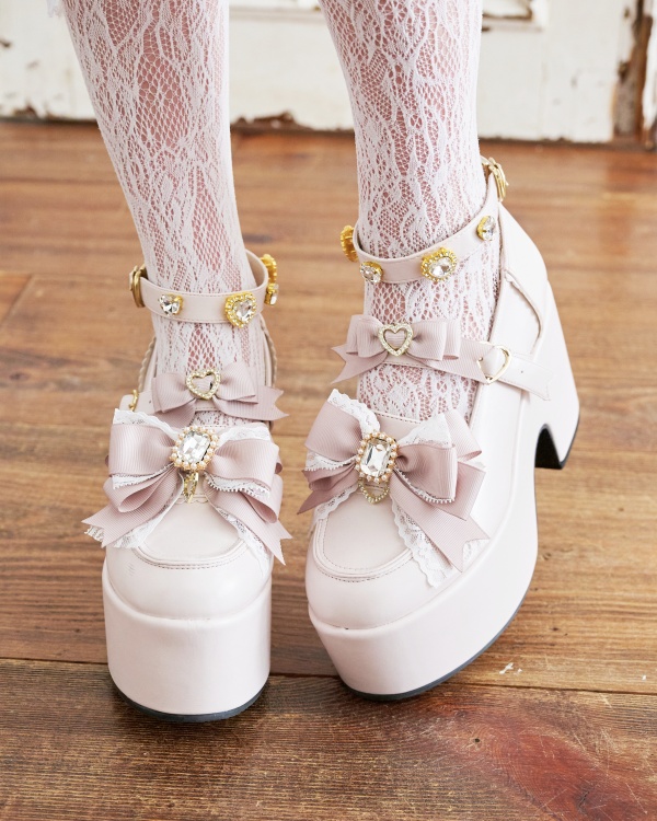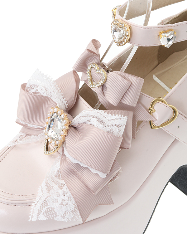 Introducing these adorable loafers with a voluminous platform that flatters your legs♡ Featuring a heel yet designed for easy walking with minimal height difference between toe and heel+* The ankle strap is adorned with assorted heart jewels, and two types of removable ribbon brooches are included—making these luxurious loafers perfect for enjoying various stylish arrangements.