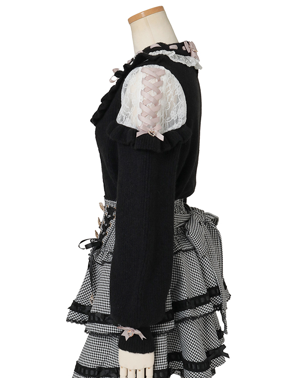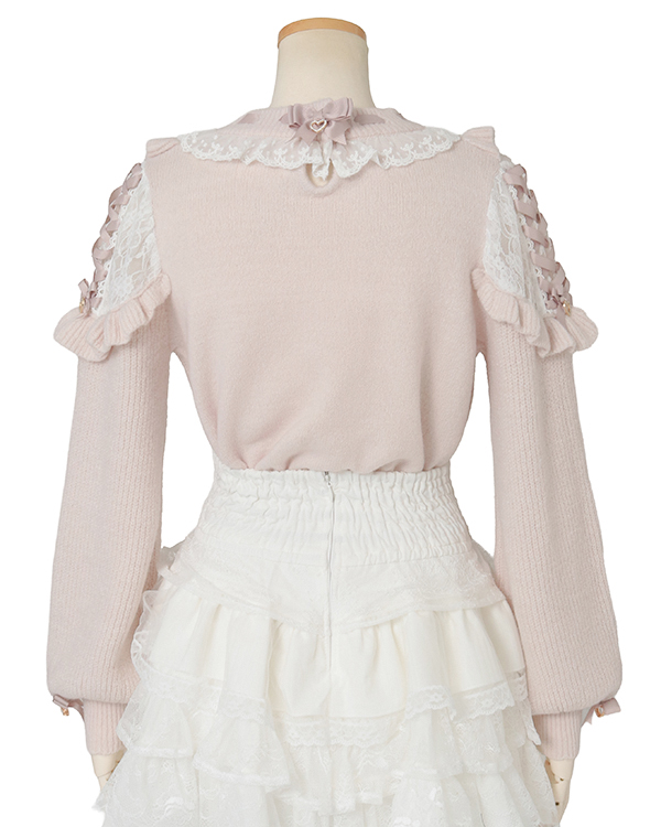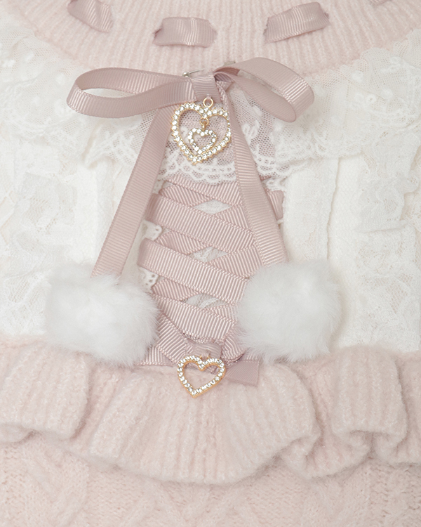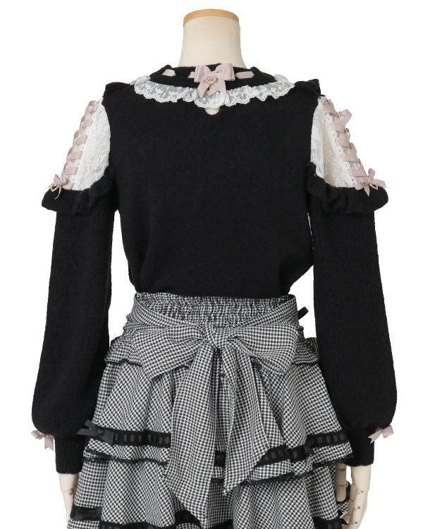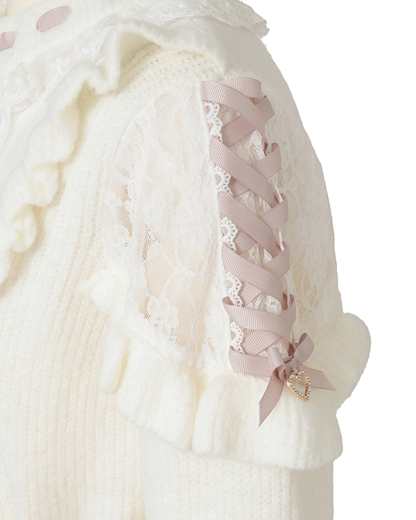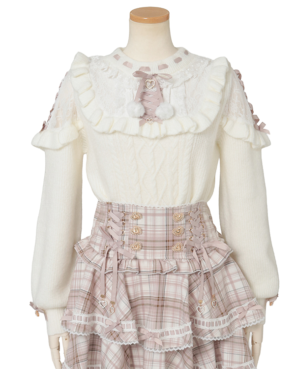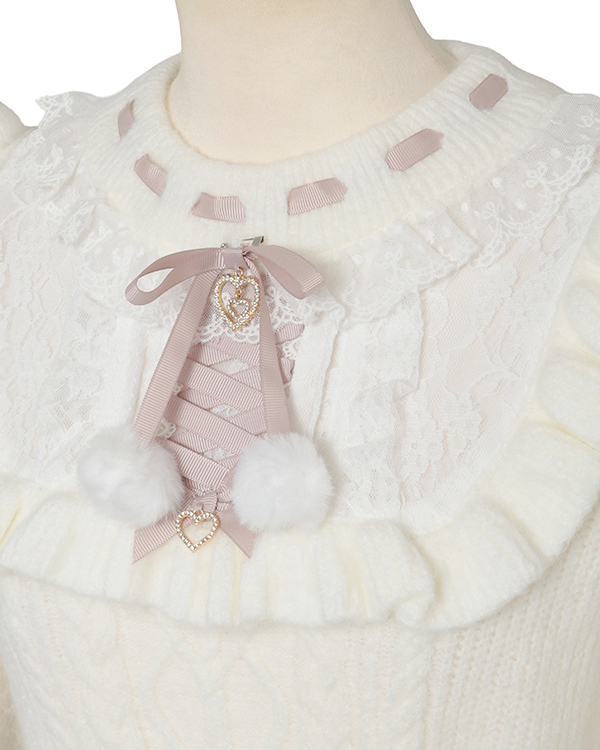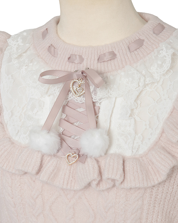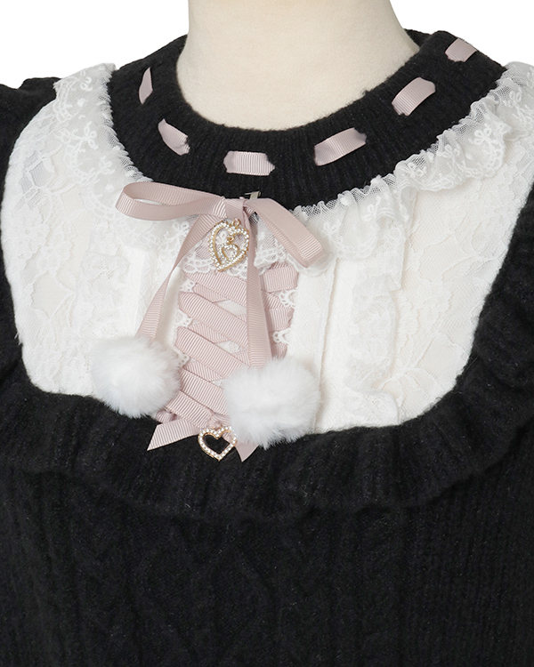 The wildly popular knit top with pom-pom ribbon is back in a NEW version! The front features a bib-like yoke design for a silhouette that pairs effortlessly with any bottoms. Dolly-inspired lace-up details at the front and sleeve seams add a chic accent to your outfit. The pom-pom ribbon is removable, so you can customize it to your heart's content!