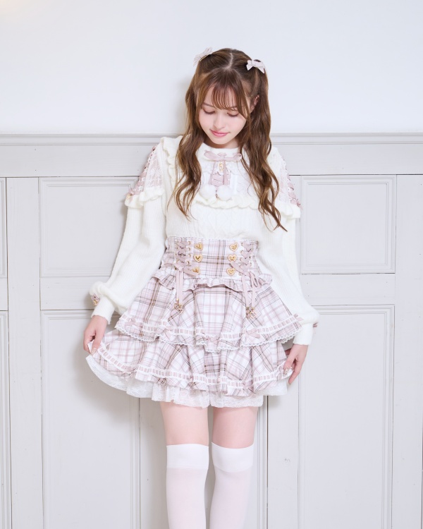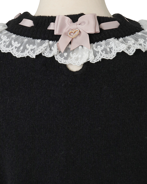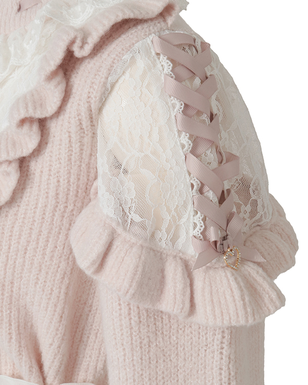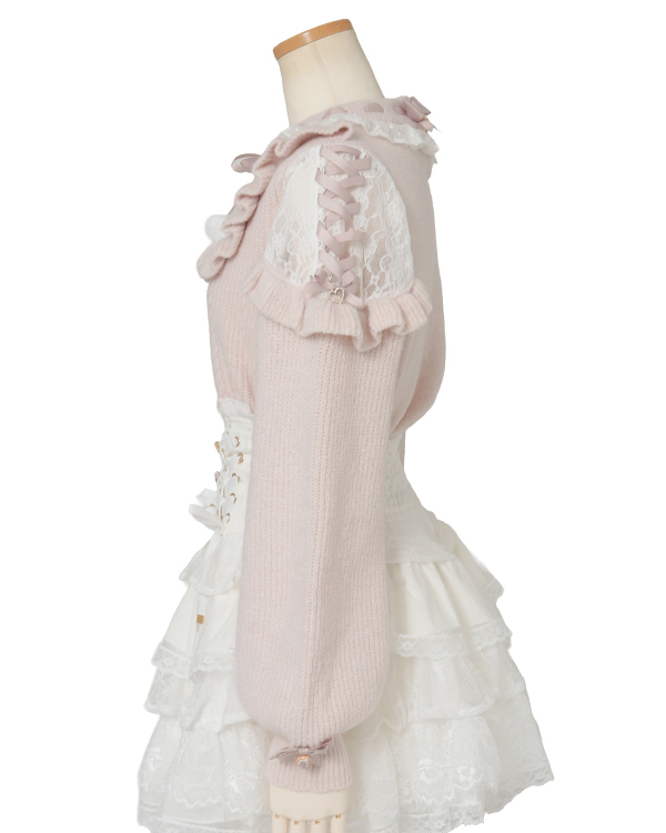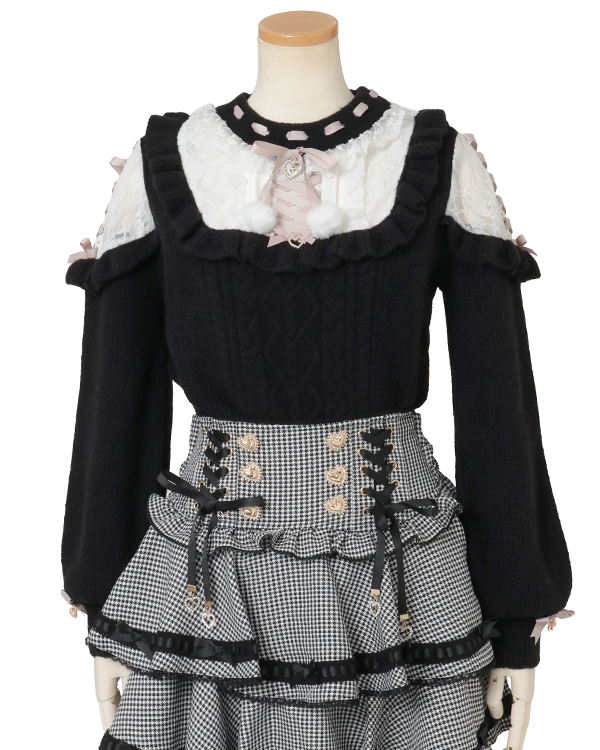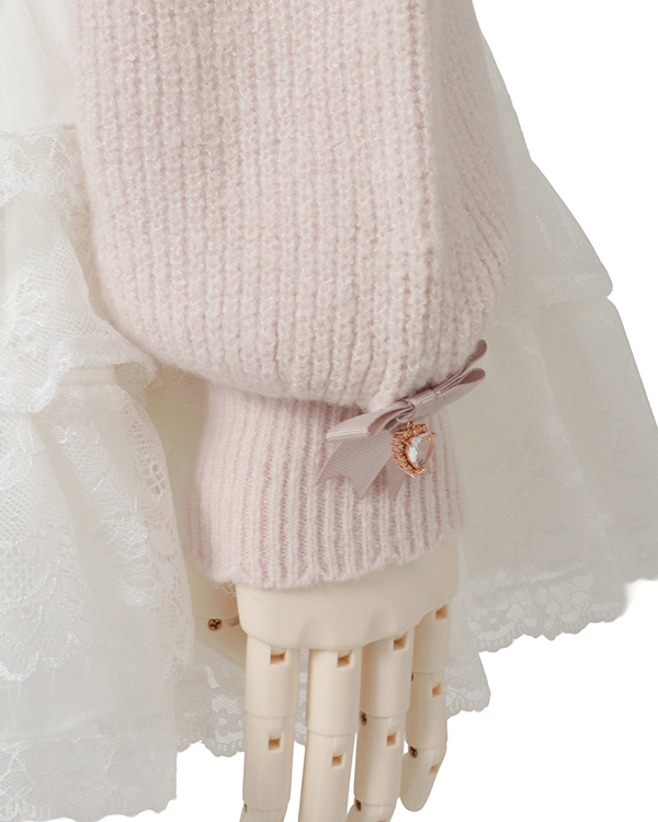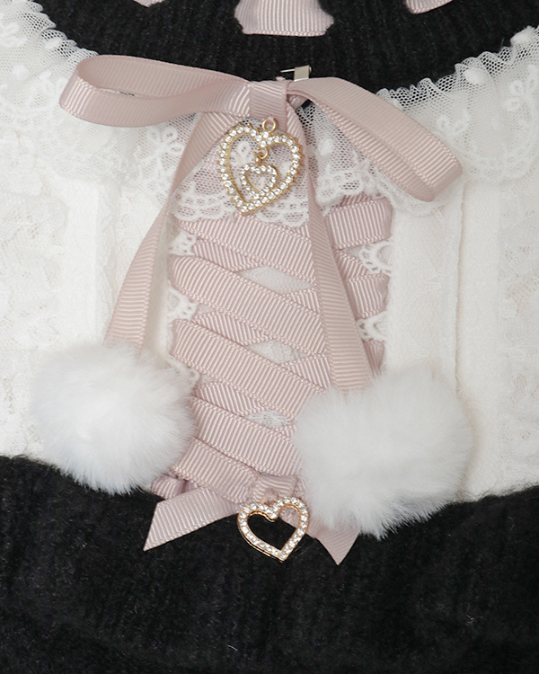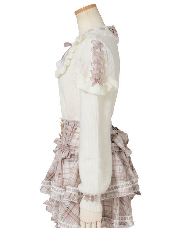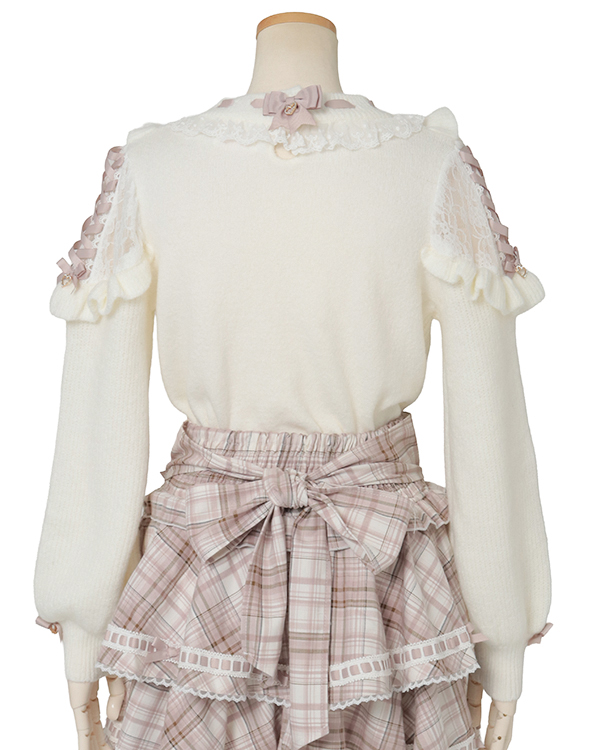 The wildly popular knit top with pom-pom ribbon is back in a NEW version! The front features a bib-like yoke design for a silhouette that pairs effortlessly with any bottoms. Dolly-inspired lace-up details at the front and sleeve seams add a chic accent to your outfit. The pom-pom ribbon is removable, so you can customize it to your heart's content!