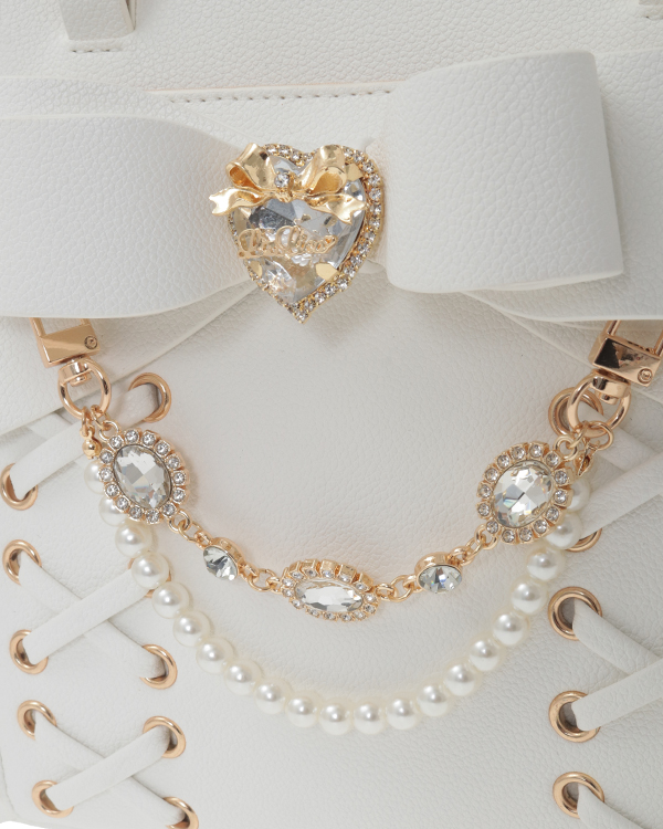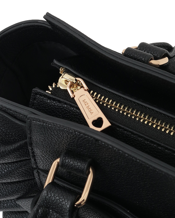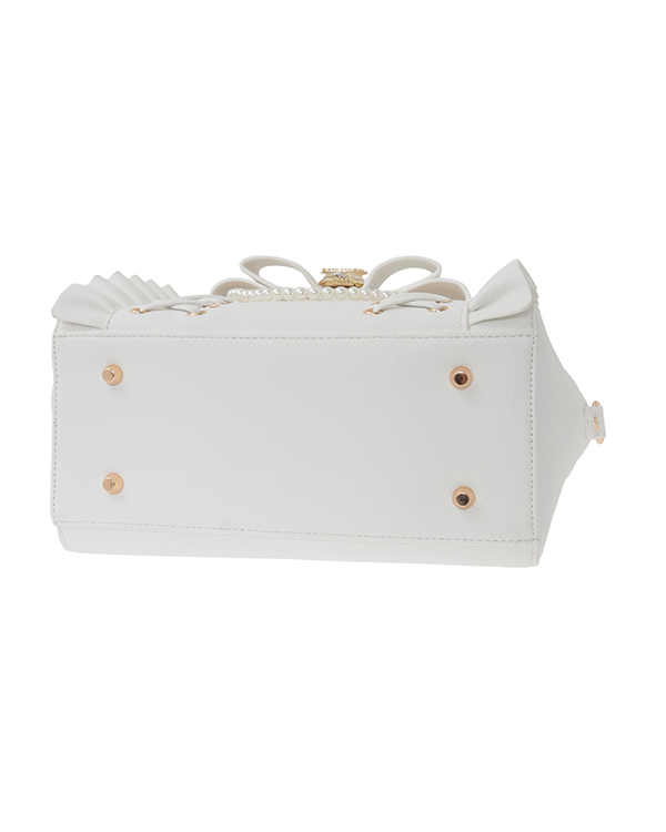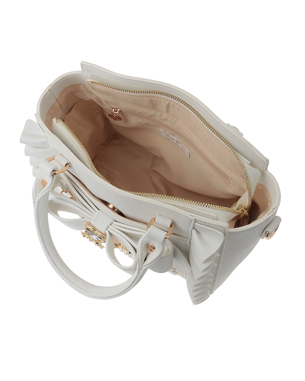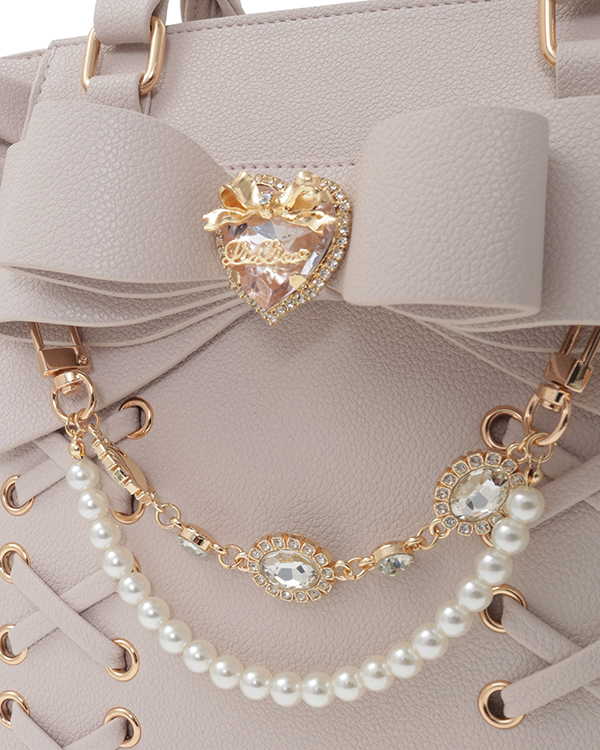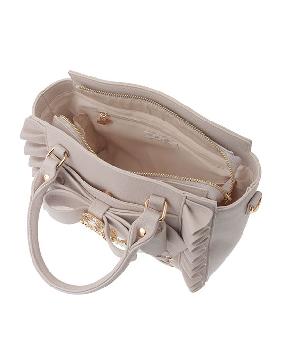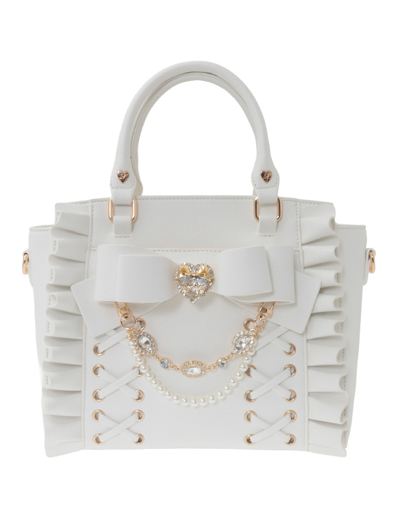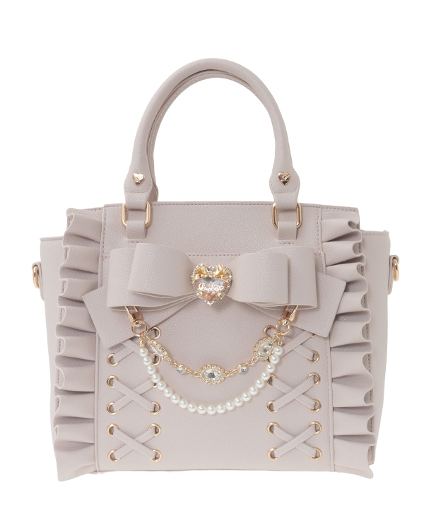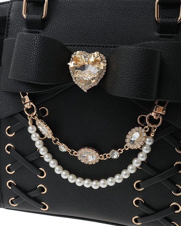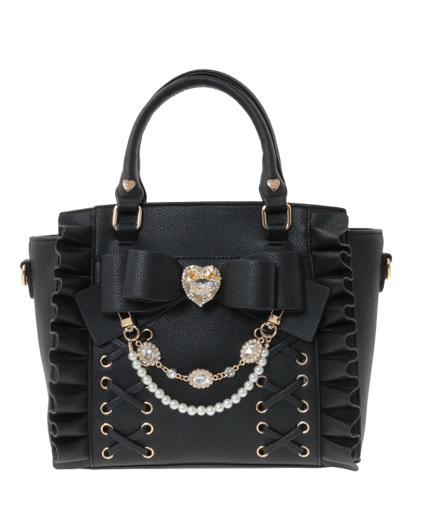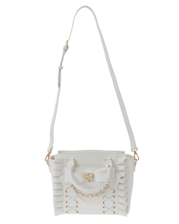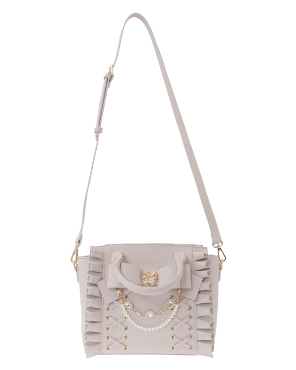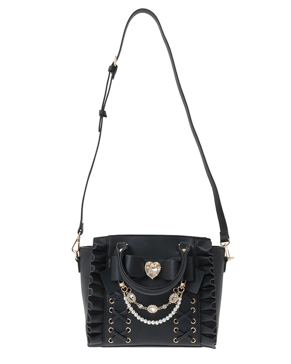 This bag features a large ribbon adorned with a sparkling jewel charm. The front showcases a lace-up and frill design, packed with adorable details throughout. Its practical size is complemented by both exterior and interior pockets, ensuring functionality. It comes with a detachable shoulder strap for versatile 2-way use. The original LIZ LISA logo jewel at the ribbon's center adds another cute touch♡