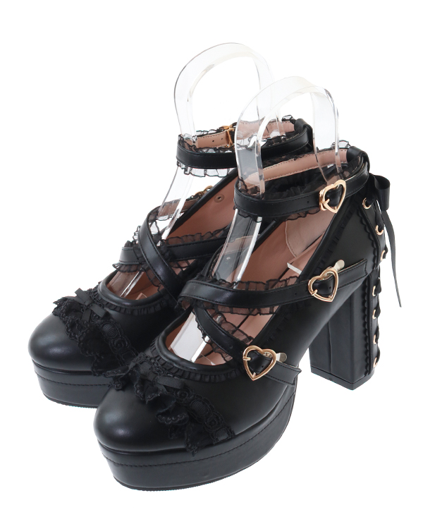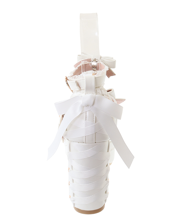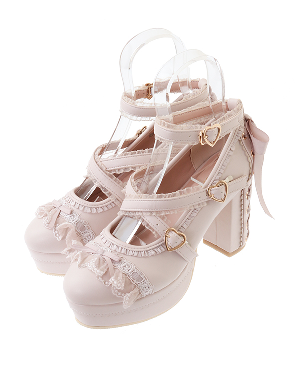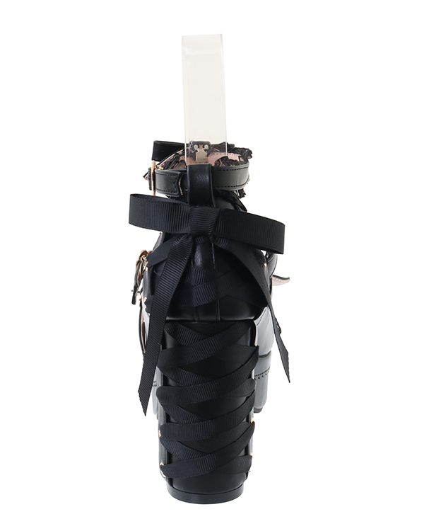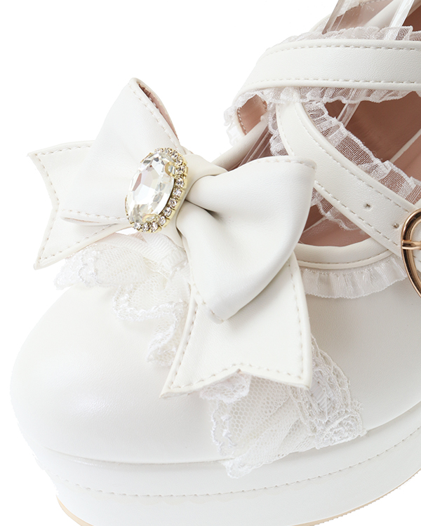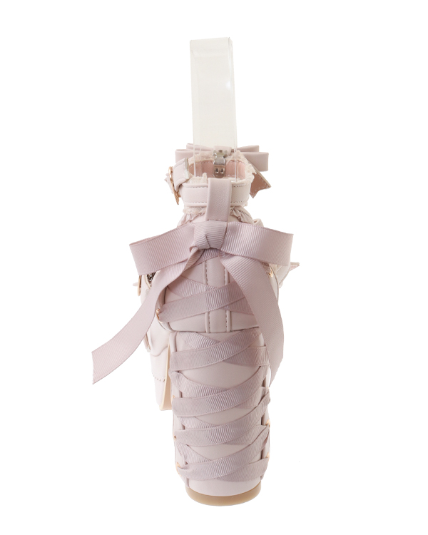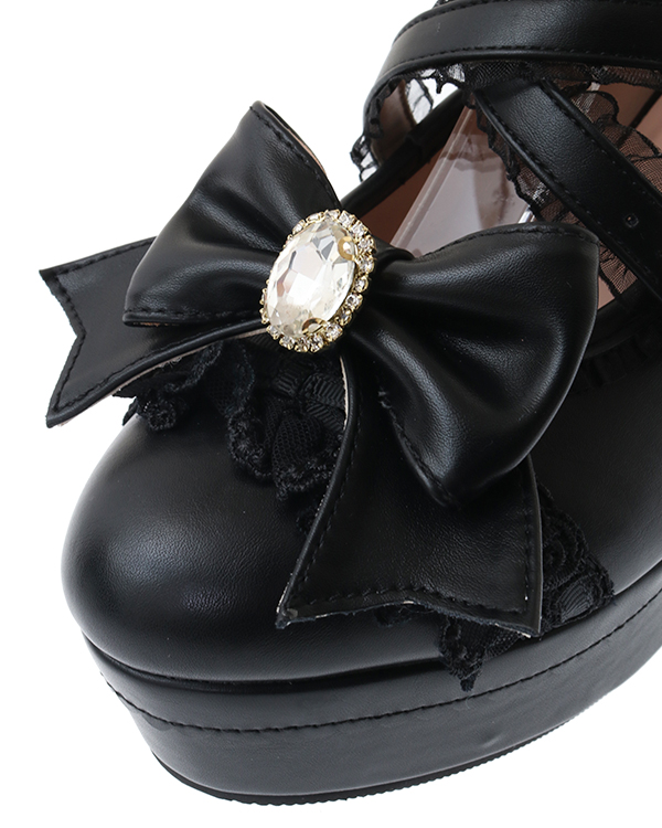 The classic thick-soled pumps are now available in a toe-shoe style design! The ribbon that wraps around the ankle is removable, so you can also wear them as strap shoes. The strap on the instep has sparkling bijoux. The heel is stable and easy to walk in.