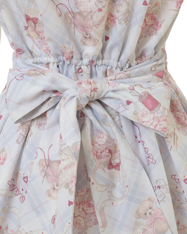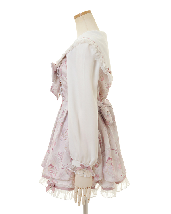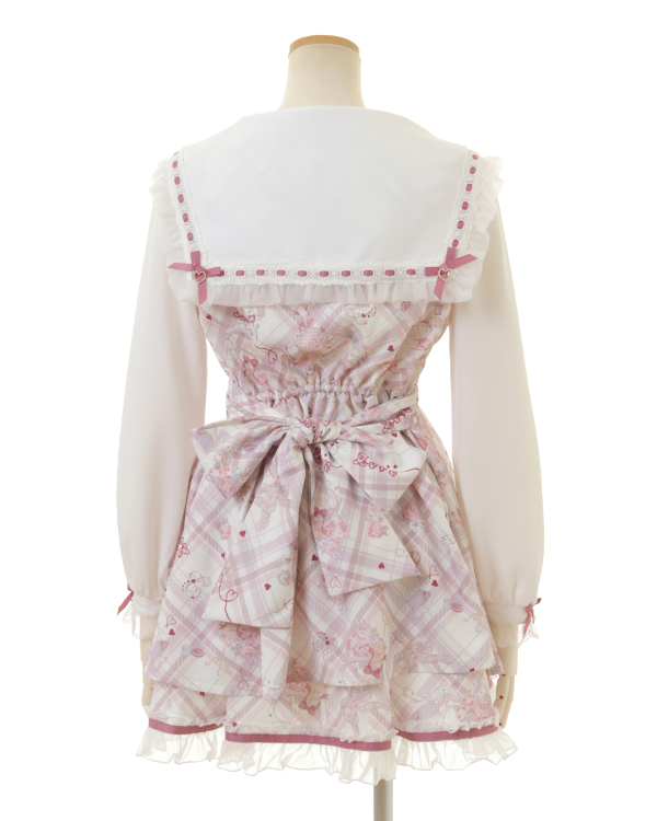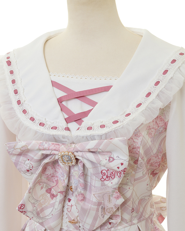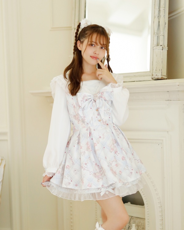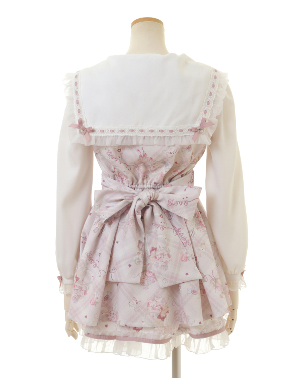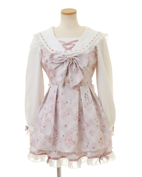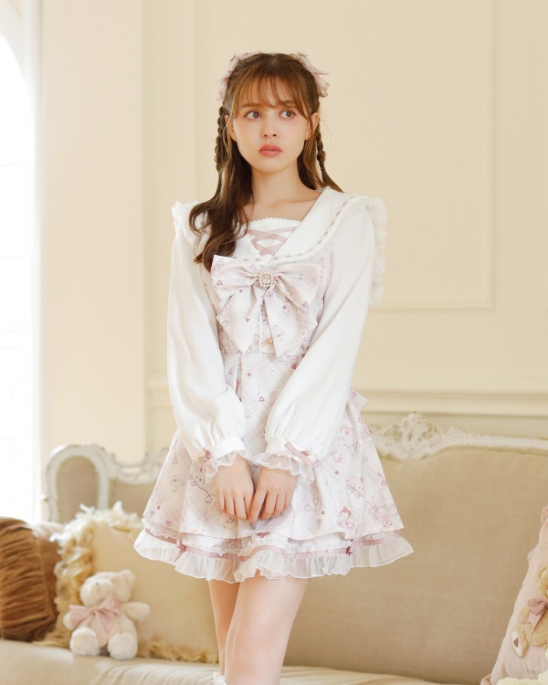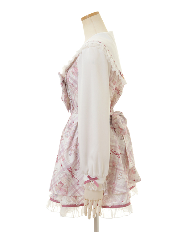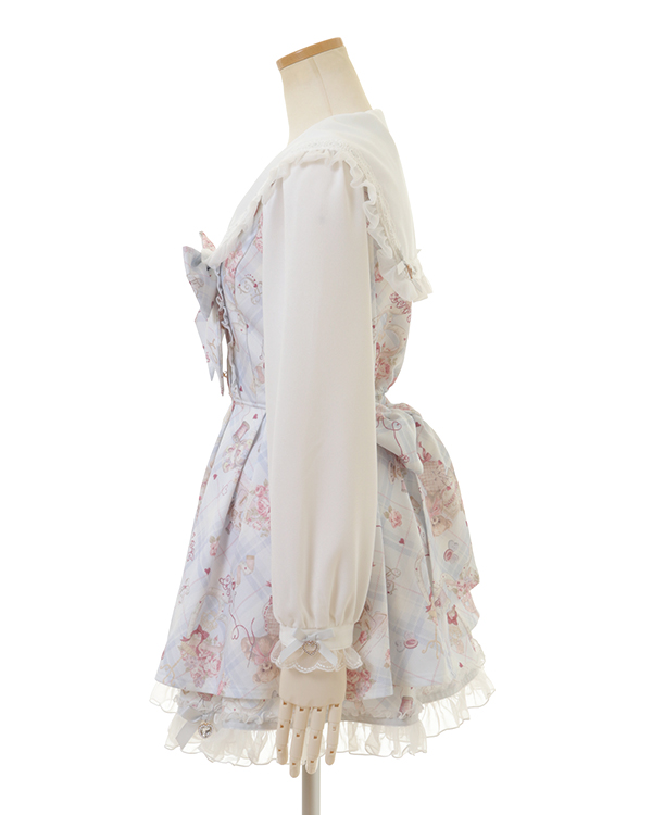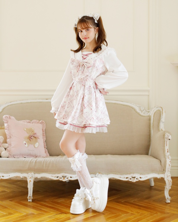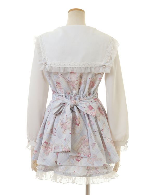 Price: 20,800 JPY ( ≈ 136.93 USD)* The original patterned set-up is back again, printed with a motif of a handsome bear sewing. The sailor collar and ribbon at the chest are the key points. The bottom part is a pair of skirt pants, which can be coordinated with your blouse, so you can also wear it with a variety of outfits.