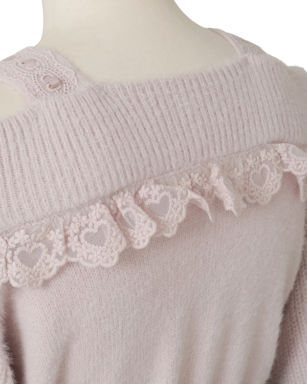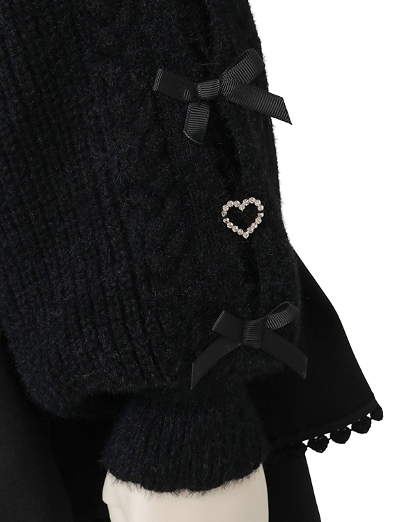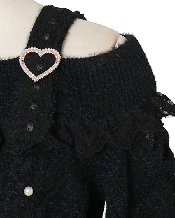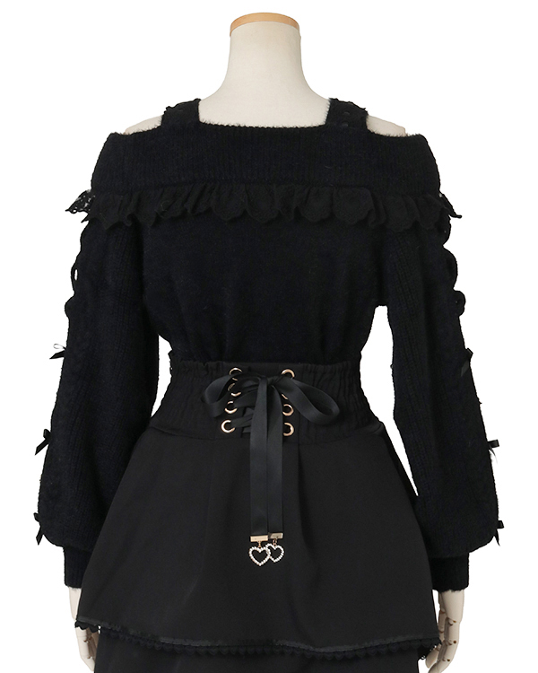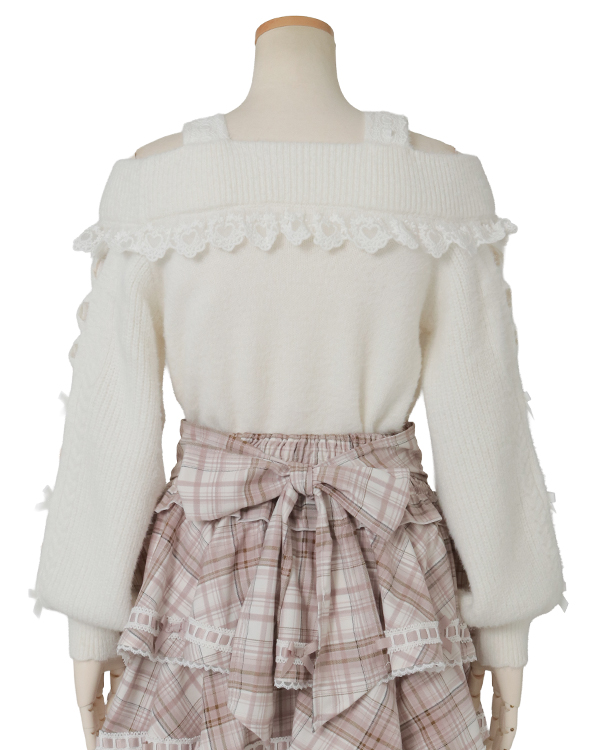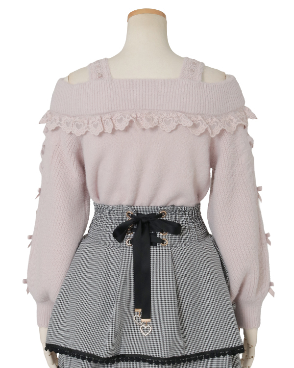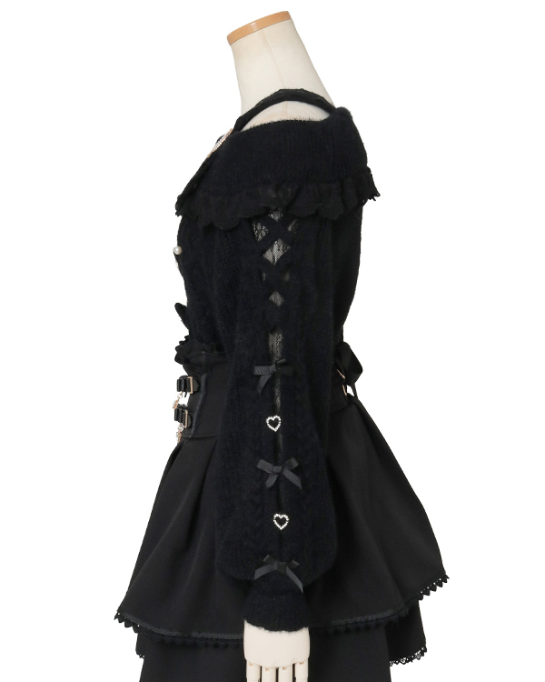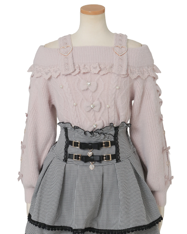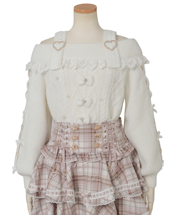 This year's must-have off-shoulder knit arrives in feather fabric♡ The front features three ribbons with heart-shaped jewels for an adorable touch. Sleeves boast a lace-up style cross design with slits, showcasing meticulous attention to detail. The wider shoulder straps provide coverage, making this a perfect piece for those hesitant about off-shoulder styles.