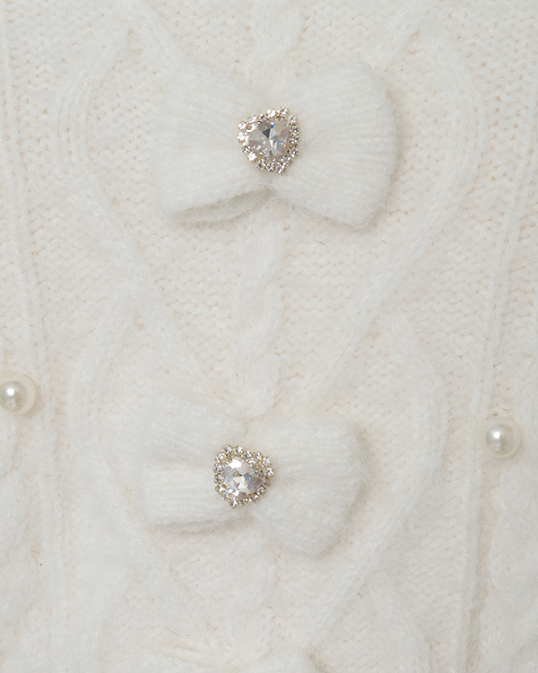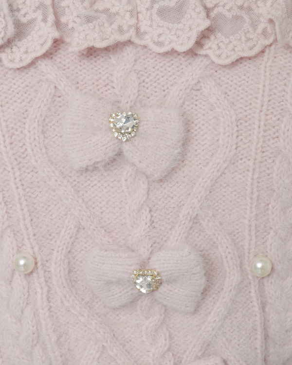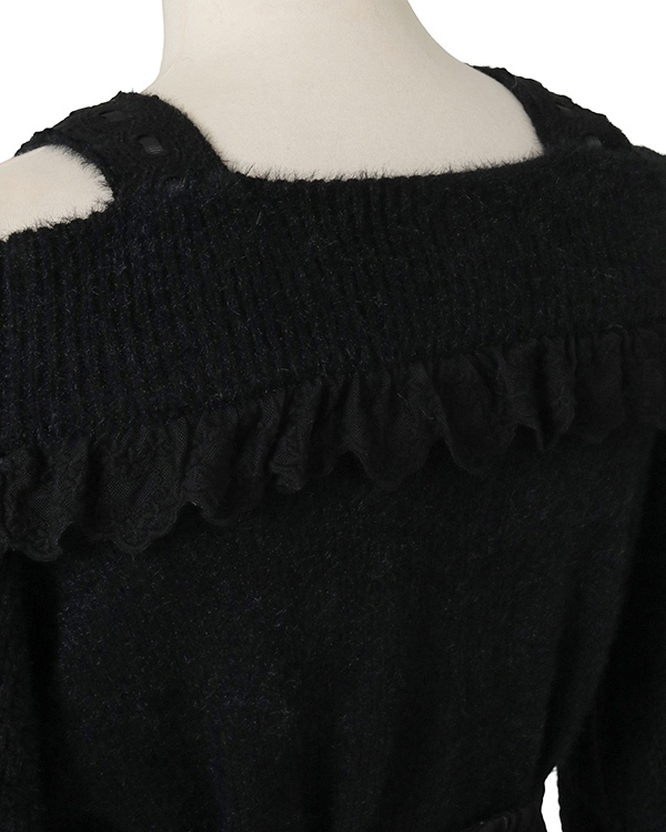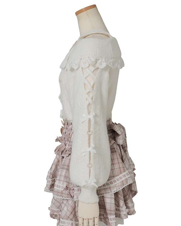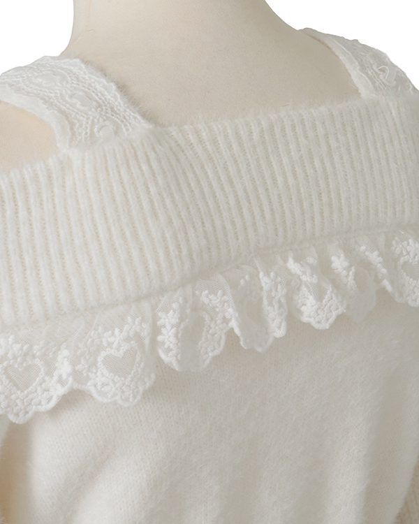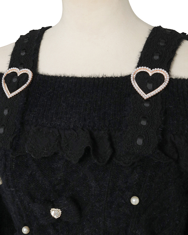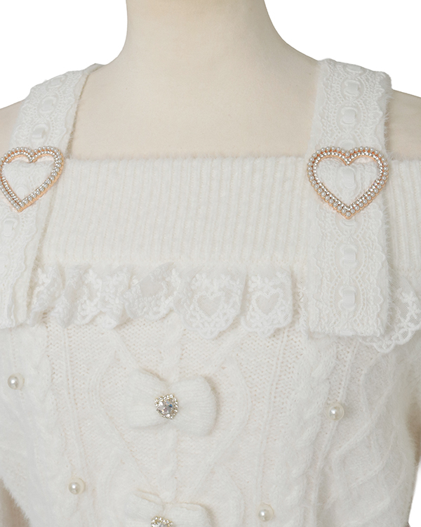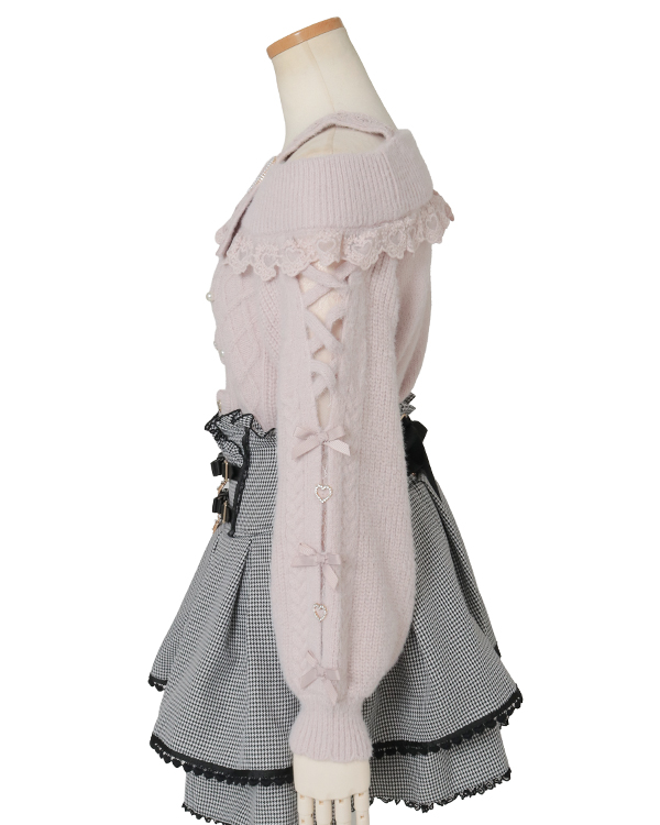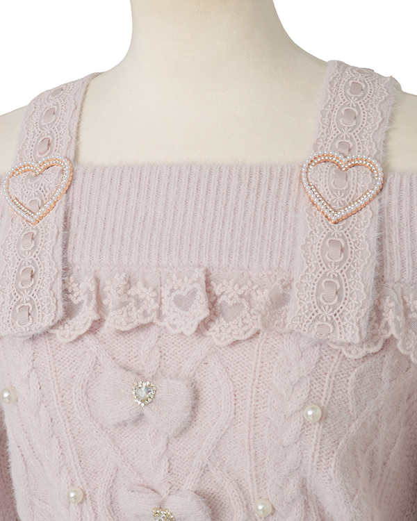 This year's must-have off-shoulder knit arrives in feather fabric♡ The front features three ribbons with heart-shaped jewels for an adorable touch. Sleeves boast a lace-up style cross design with slits, showcasing meticulous attention to detail. The wider shoulder straps provide coverage, making this a perfect piece for those hesitant about off-shoulder styles.