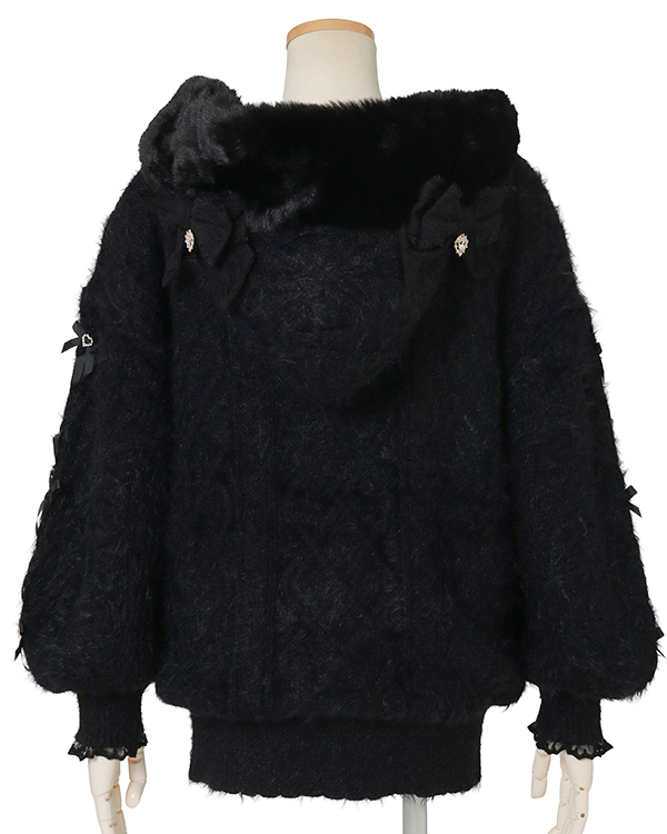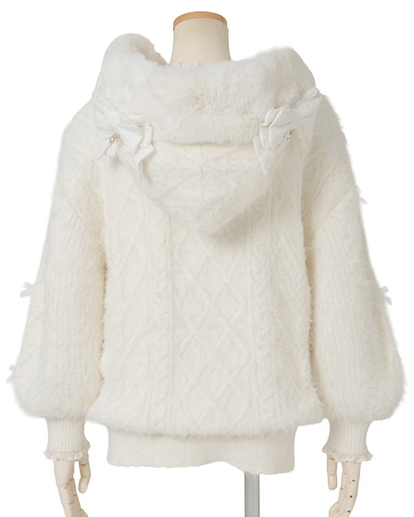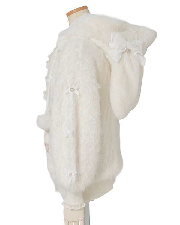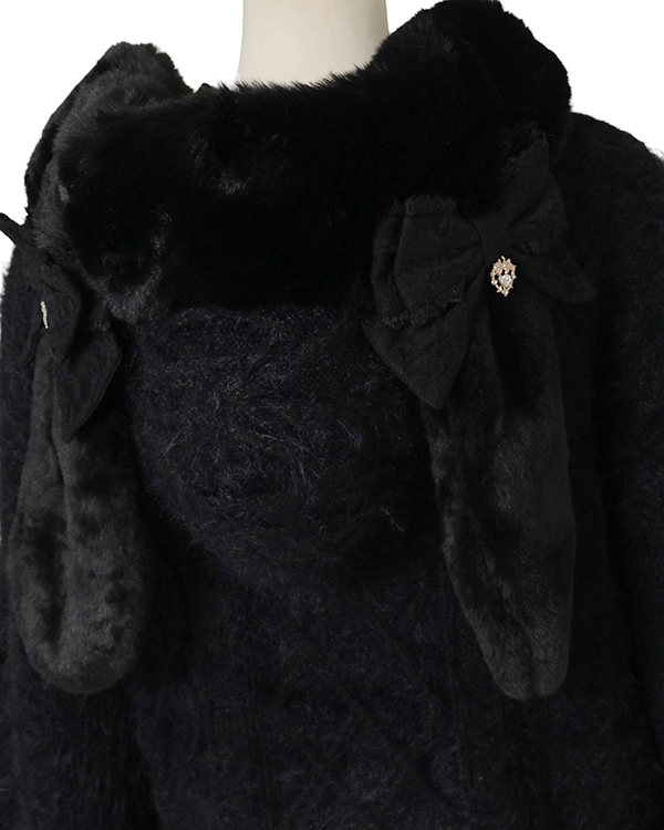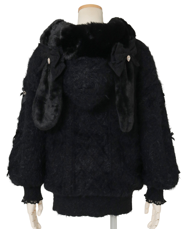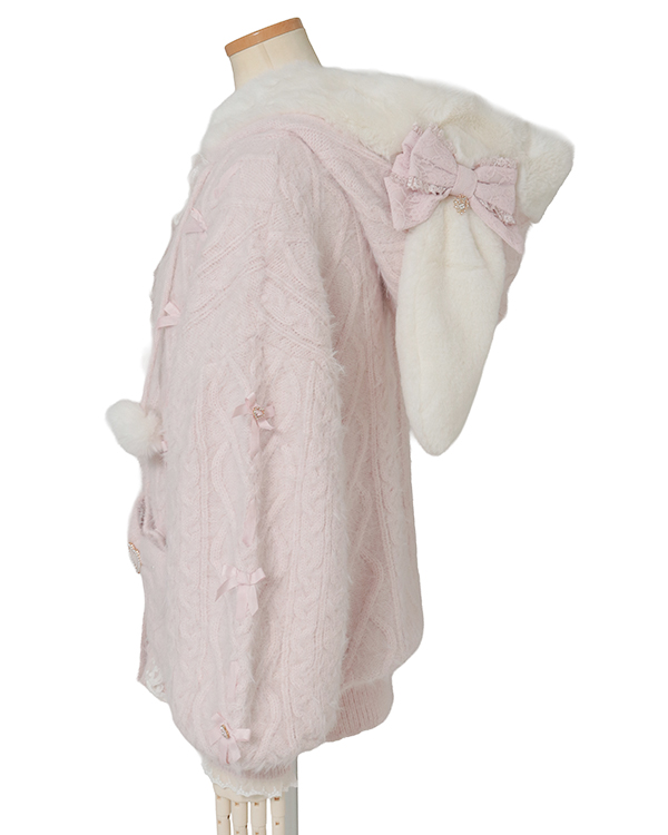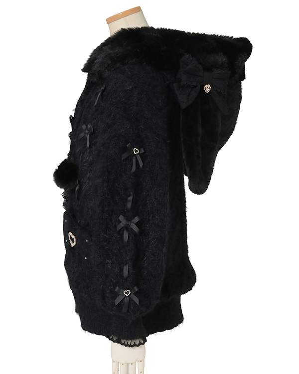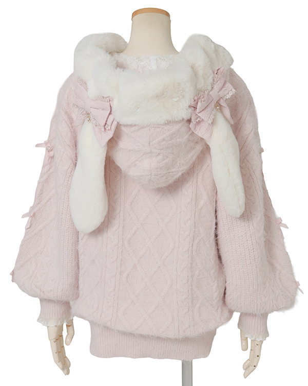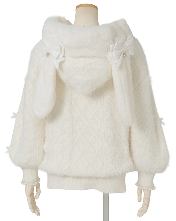 The super popular bunny ear hoodie is now in knit fabric♡ Made from fluffy feather knit with a lining for excellent warmth. The many ribbon details add a cute touch. The bunny ears on the hood and the ribbons are removable with buttons, so you can customize it to match your mood each day.