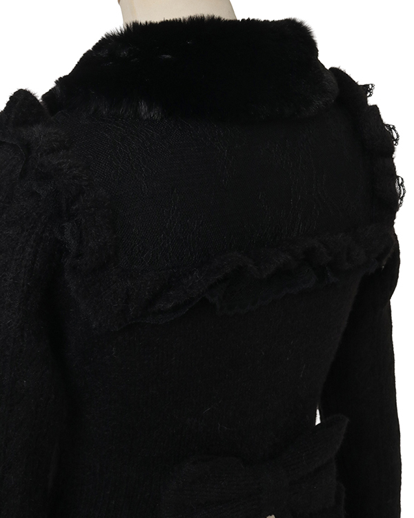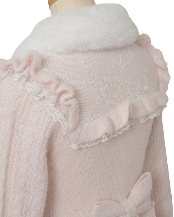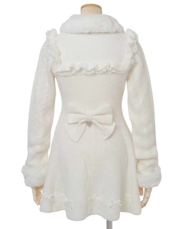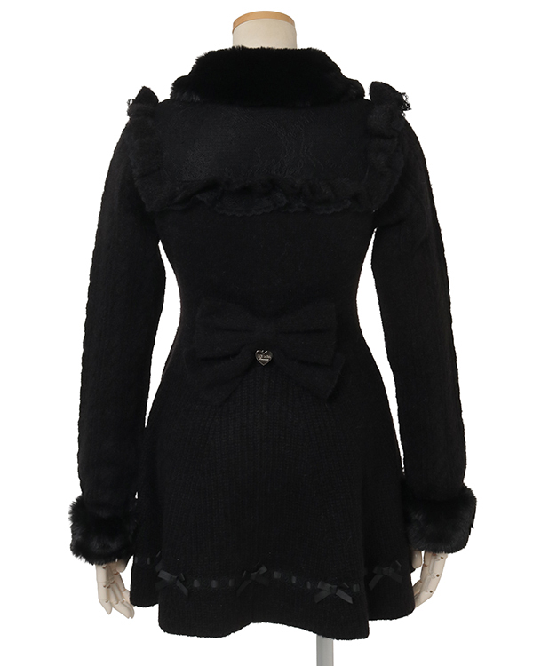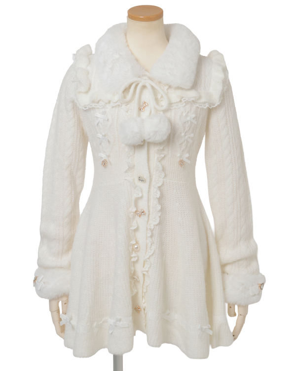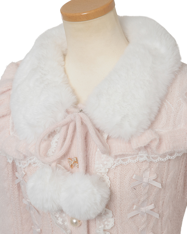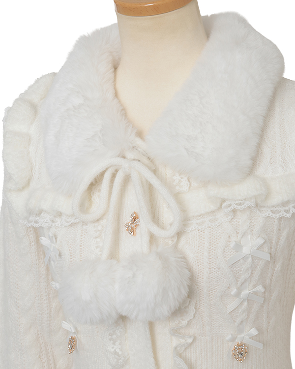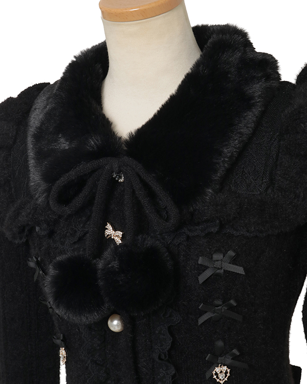 This cute knit cardigan features a peplum silhouette. Removable fur trim adorns the collar and cuffs, making it the perfect piece to elevate your winter mood. Two ribbon brooches are included to attach to the collar, allowing you to choose based on your mood each day. Wear it as a cardigan, or button it up over a top for a dress-like look.