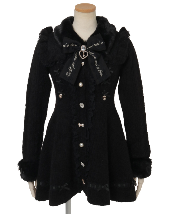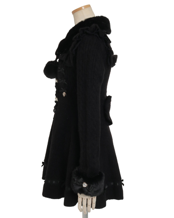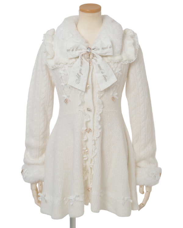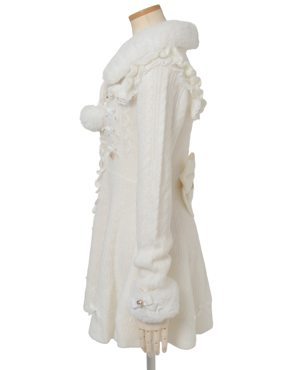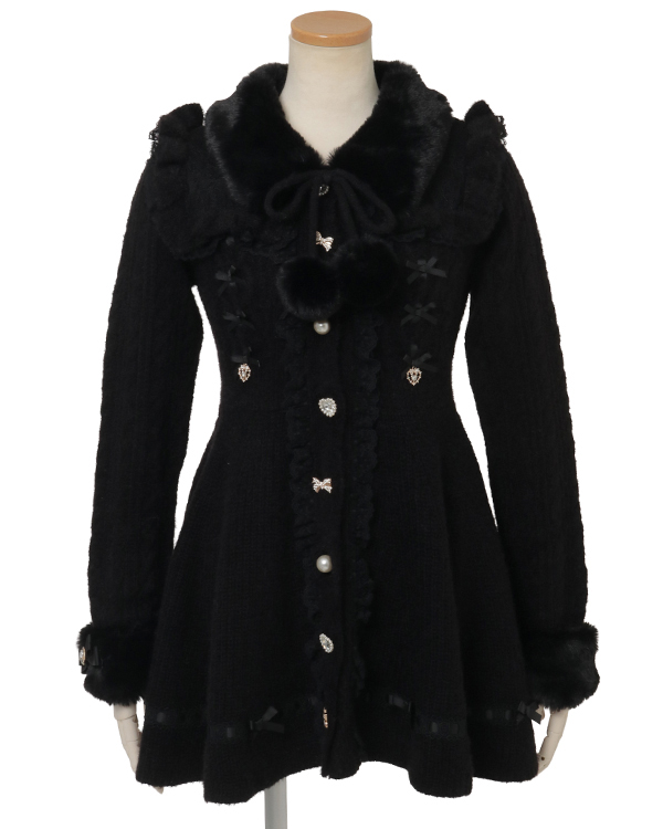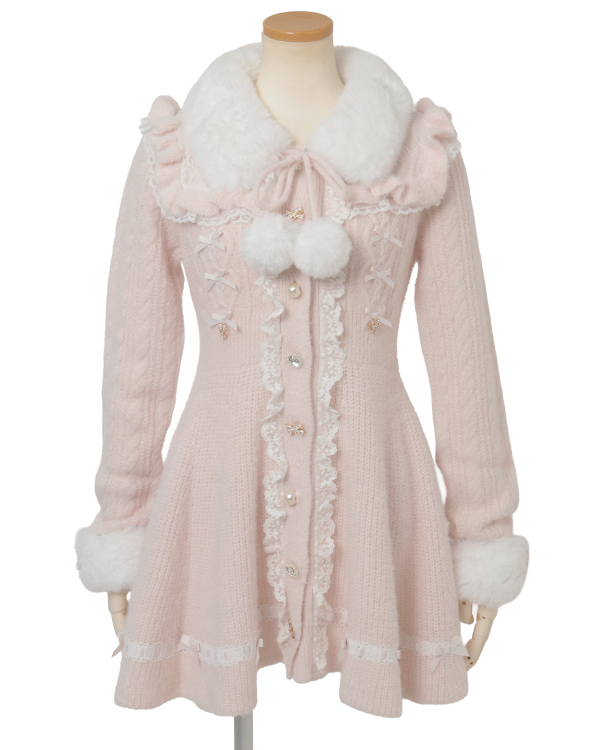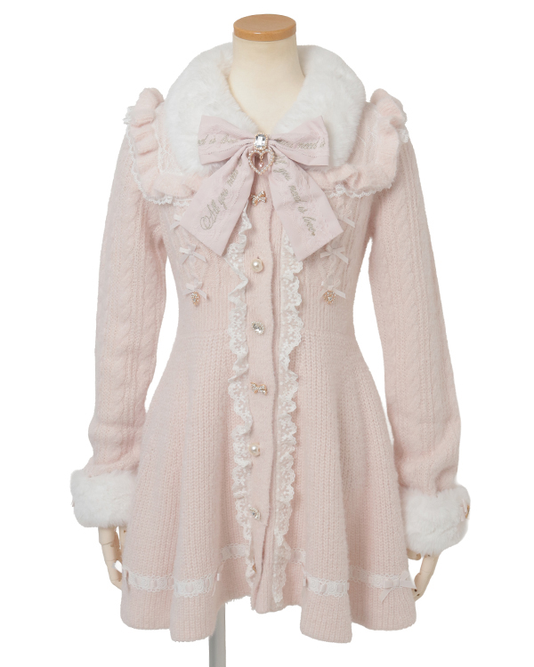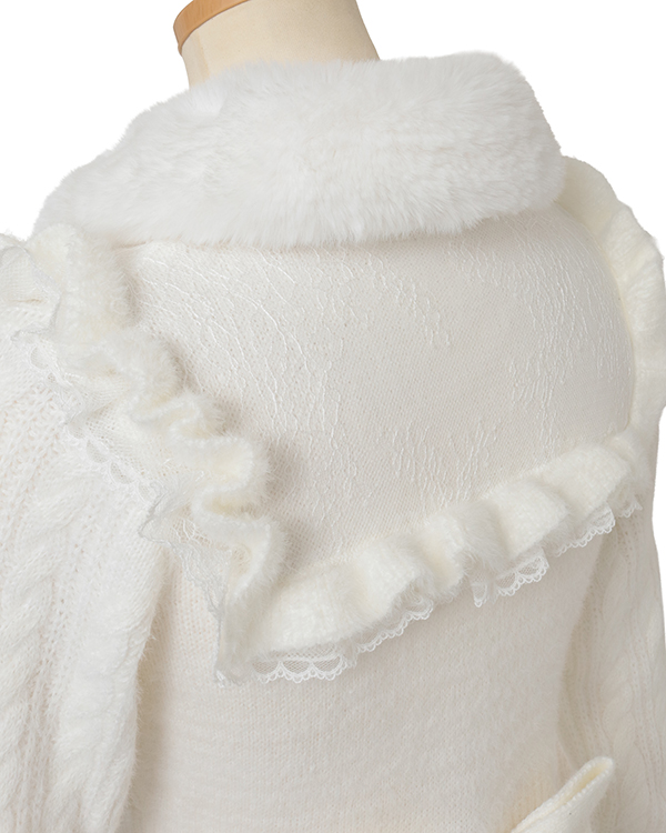 This cute knit cardigan features a peplum silhouette. Removable fur trim adorns the collar and cuffs, making it the perfect piece to elevate your winter mood. Two ribbon brooches are included to attach to the collar, allowing you to choose based on your mood each day. Wear it as a cardigan, or button it up over a top for a dress-like look.